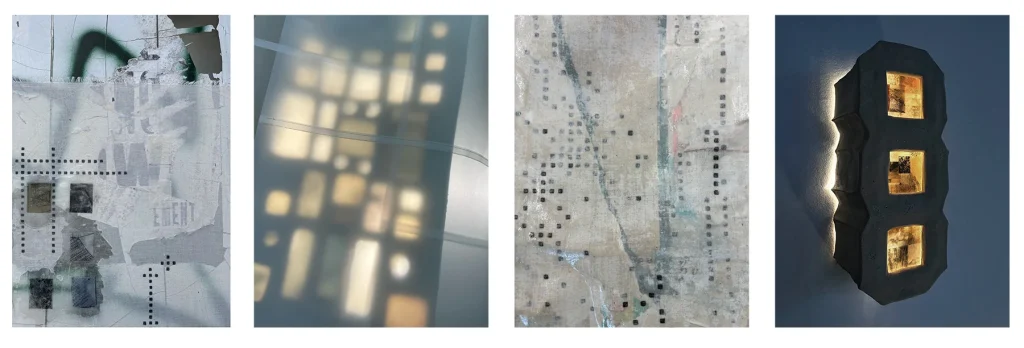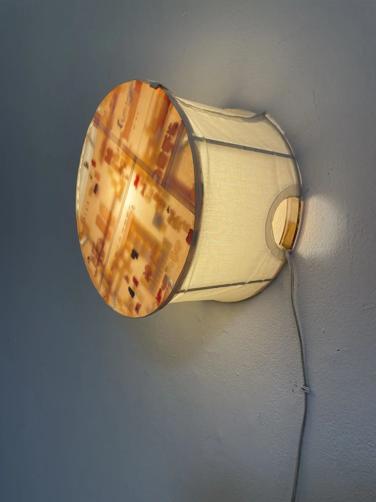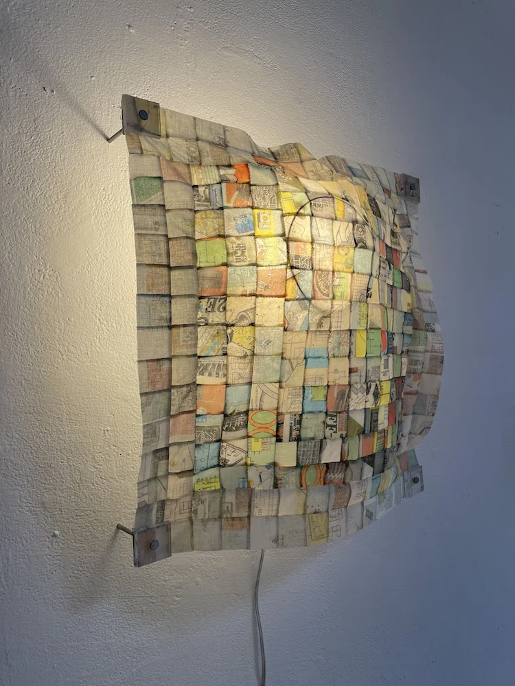 Material exploration remains crucial when manipulating and understanding our sources. Exploring methods of illumination and transparency has been one way of discovering kinetic, living qualities within the work. New intuitive visual languages are uncovered as we layer our hand within found material. An example is using perforated aluminum sheets as a drawing tool: commonly found in urban architecture, stores, and buses, this structure becomes a tool for mark-making—extracting our own patterns from the once-static object and changing its original use.