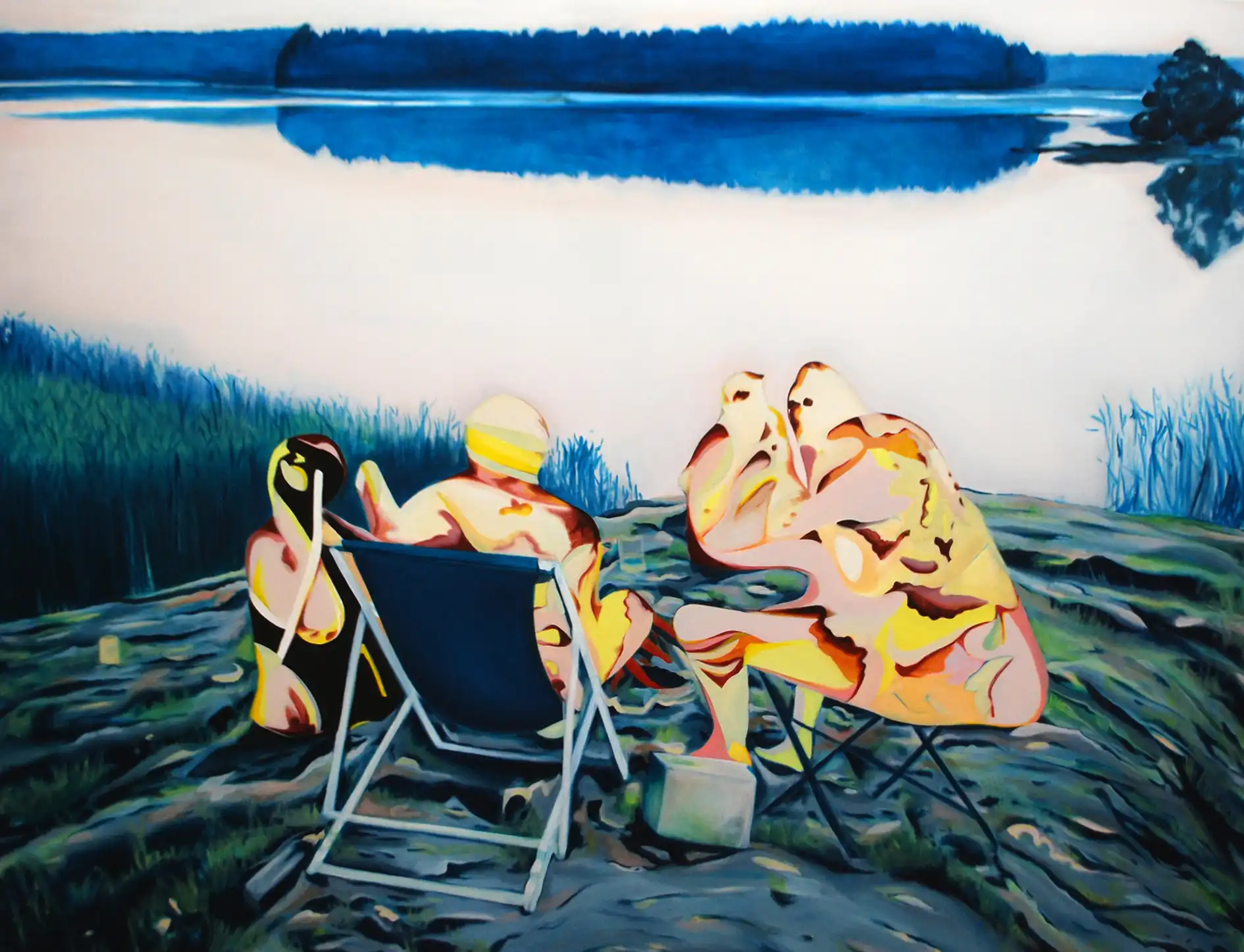 Because the paintings split up and live in parts, the work itself functions in a similar way. The smaller works, each with a painting of a detail of the photo, have been separated from the large painting and exist independently of it, and independently of each other. Other paintings are created by using the residue of cut outs to reflect on the aftereffect of the radioactivity. Like nuclear fission, their information spreads like energy, unrecognisable as separate parts, but with the story of their origin as a reminder for those who choose to tell the story. The information is distorted in this way, and its reliability is called into question. A tension arises between the factual information of the cropped photograph and the information that is transmitted via memory and stories, where neither the factual information nor the memory leads to a reliable image.