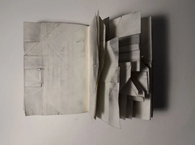 Moving around from side to side. By need and will of trying out, of searching, looking: To go. Settling here, working there, creating. I´m a nomad who is always taking decisions due to the impossibility of transporting everything, focusing on the essential for each moment. The things are light, movable and with the possibility to transform into others, to multiply. On blank pages lines are made by the folding of the paper using only the hands and nails. Paper folding paper that opens and closes itself, obeying to grids and exploring the division and sub division of different arrangements. Other sheets are teared apart, taking their own way. Front and back. By folding I bring forth what’s in the back in to the front, questioning about the bi-dimensionality of the material – the paper – and discover what it has. I have this attention, therefore I communicate it. The back of the sheet is also a page,. it also belongs. It´s a whole. My thinking is close to the things that deal with space and time, and consequently its relation to Man. I am a Man, and as a human that travels in different speeds, I am aware of the change of rhythms, cycles, of all the lines of time itself in space. Whilst creating I concentrate on this; I concentrate on me. On the lines, the cycles, the rhythms inside and outside of me.