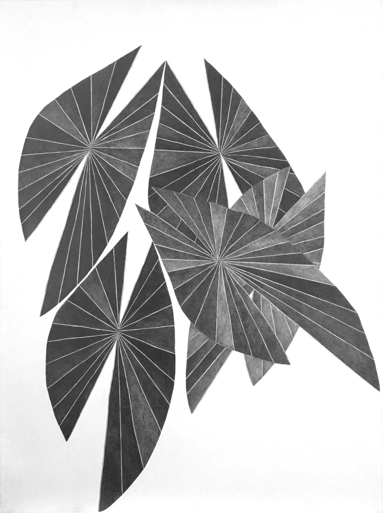 As a visual artist, Elise’s drawing practice combines plant and mineral elements, architectural observation and geographical maps. Her different ways of drawing, on paper with graphite or on the wall with steel points (Steel Drawing) and black velvet, attentive to the exhibition space, are based on the observation of light’s interactions on materials and surfaces, and the resulting illusion of movement.