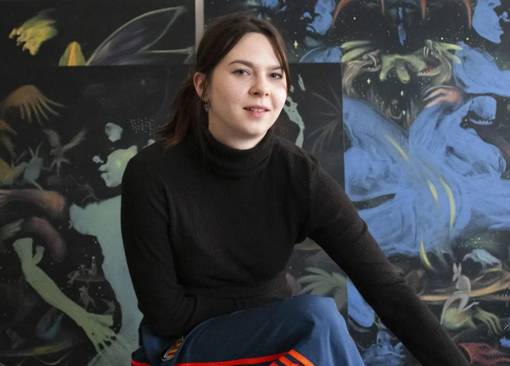 I don’t know. I never know. I can make the paintings very detailed. There was one about Adam and Eve. But Eve decided to leave Adam. She was just tired of him constantly claiming she comes from his rib. But when there was any problem, it was only her fault – a bit absurd, right? So I was working on this painting for so long. I was finishing it and the girl I was renting the studio from, came for her stuff. She told me, ‘Emilia, I look at this painting and it’s looked the same for a month now. What are you doing with it?’ She actually helped me finish it because she told me she doesn’t see any difference. Sometimes you just have to set a timer for yourself because you can get so dialed in. And you don’t know when to stop.