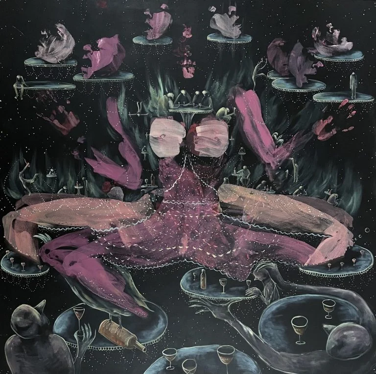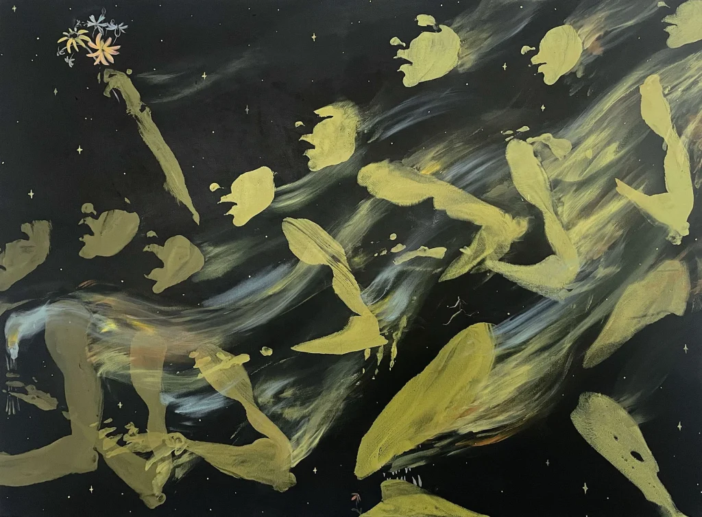 Emilia uses her body as a brush to imprint herself on canvases, merging with her art as a form of therapy and self-expression. Inspired by Lou Andreas-Salomé’s interpretation of Narcissus, Emilia views him not as vain but as someone who discovers his essential role in the beauty of existence. Like the water reflecting Narcissus, her paintings aim to mirror and affirm life itself.