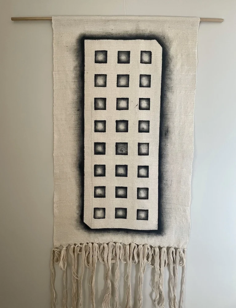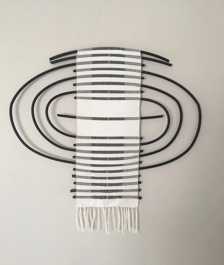 In my work line is a metaphor and repetition is a tool. With these I link my own life to the materials and processes. The loom acts as a second body that holds the tension of these lines allowing me to examine how they overlap and connect to create depth, weight, and form. On the loom, I am able to visualize a personal landscape within a larger timeline. I’m interested in the ways we give and take, how a structure can reflect meaning, and what it means to be grounded. In turn this form of processing ideas in a physical way creates my minimalistic imagery that others can see themselves in.
