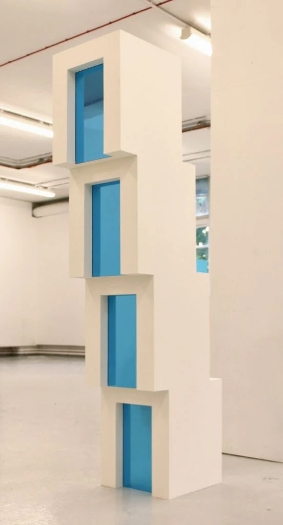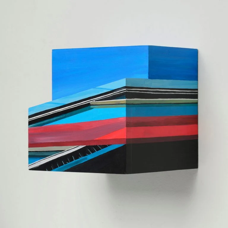 I am intrigued by our human desire to categorise everything in terms of form and function. This instinct is challenged through my work as it sits somewhere between painting, sculpture, object and architecture. Materiality is therefore a fundamental aspect, as the viewer intuitively attempts to define it in terms of medium. I select particular materials in order to re-create a sense of place and portray the key characteristics of the area they are representing. This is illustrated in ‘Hackney, I love you. I lost you.’, which was inspired by a doorway I photographed in Hackney. I printed my photograph of the doorway’s graffiti onto canvas and built this into an architectural structure. Due to the texture of the material, the print appears as a realistic painting of the site, as well as a re-creation. The painterly effect aims to evoke an impression of Hackney’s creative community and culture. Colour is a vital component of my work and is significant within the architecture that I choose to photograph. Certain areas of the city embrace bright colours and welcome street art. In contrast, clear white buildings with blue glass reflect capitalist progress, with an attempt to appear as professional institutions. Colour has the ability to encourage conceptual interpretation and assert visual impact.