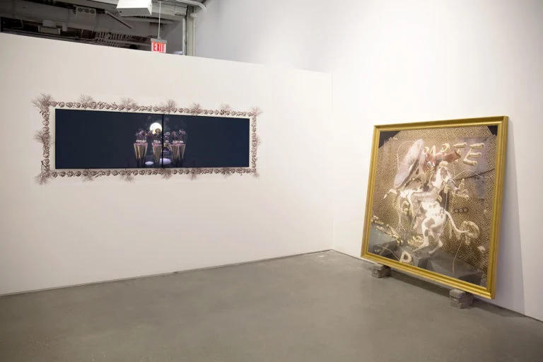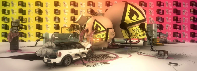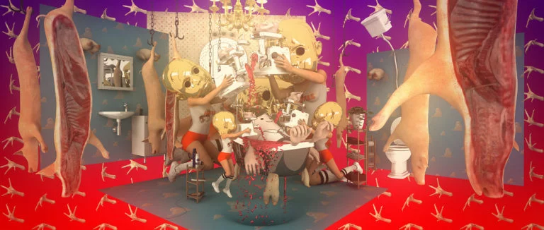 Frank Yefeng Wang’s projects incorporate media including 3D animation, 3D prints, digital prints, VR and sculpture, resulting in installations full of poetic and peculiar visual language. As a digital native, his current work grapples with obscure borders between the real physical world and artificial virtual spaces. His most recent works are an amalgamation of the various landscapes he encounters – drawing inspiration from contemporary iconographies, mythologies, and inspiring/enlightening proverbs and delirium found in old books. Rotation Method (2018) is exemplary of this. The animated short film depicts a surreal journey of a traveler in a gold plated racing helmet accompanied by a dog with a phonograph shaped-head. Referencing the rotation method theory by Kierkegaard, the film places a great emphasis on the emotional transformation of moving to and residing in the United States. Another work, [‘penthaus] (2017) quotes Liu Ling’s claim of the universe as his house and the house as his underpants in “Shishuo Xinyu”. In the animation, a virtual home, in the shape of a common pair of jeans, is traversed by a pig without backlimbs – a metaphor for the strong psychological experience of my ongoing sojourn in the west. Both of the recent works offer meditations on the artist’s experiences in the United States in comparison to his metaphorical “past life” in China.