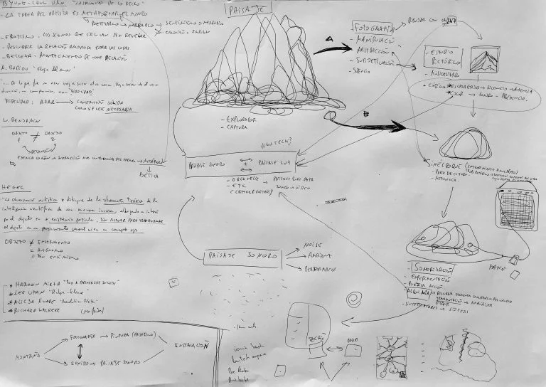 In his production, he subordinates the technique to the concepts that he is analysing and building. He is currently mainly working with contact microphones, analog synthesizers, audio production software as well as 3D scans and prints and 3D modelling software. All combined with projections, photographs, paintings or drawings to generate as a result a constellation of artefacts, interactive pieces and installations.