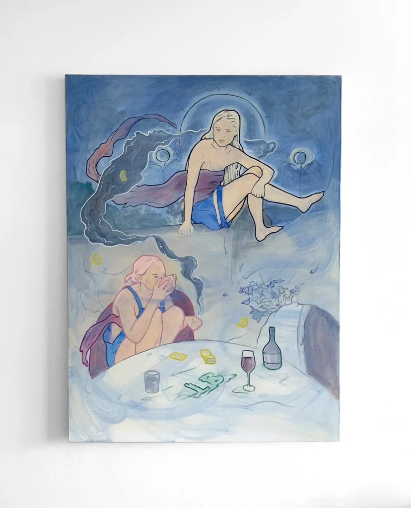 By playing with the kind of incongruous associations that arise between images she wishes to elevate her paintings to a place between humor and wonder. Inspired by genrelike scenes, Honey’s paintings show real life people caught in particular moments, but the combination of these moments in the juxtaposed images transforms them. Creating a feeling of being out of time.