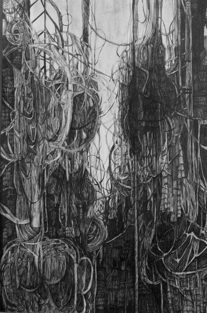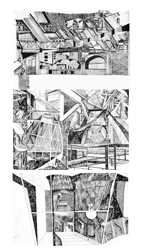 The artist aims to create generative and speculative drawings which counteract the simplistic and reductionist graphic style of modern day architectural technical drawings. She takes interest in the act of visualizing conceptual ideas by warping traditionally dominant and formal organizational design elements.