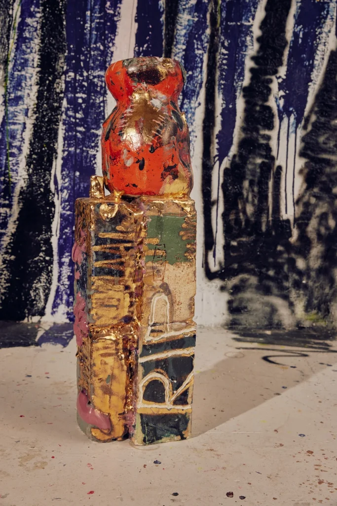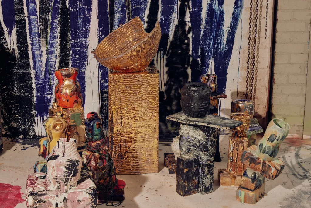 Lemon’s work evokes religious elements, pop culture, and insects. While clay is his primary medium, Lemon often adds unconventional elements like bricks, precious stones, and discarded items to enrich his artistic language. His ongoing project, “SPHEXISHNESS,” addresses ecological concerns, specifically insect population decline and climate collapse. Through intuitive making, Lemon’s sculptures act as memorials for declining life forms, offering a commentary on the interconnectedness of human and natural worlds.