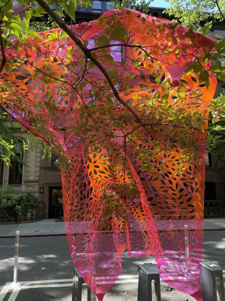 The disorienting use of light, combined with the softness of the fabric, creates an immersive experience that can transport people out of their world, into a space where she can allow herself to feel tender. Her pieces are rebellions against the politics of hard power, contradicting the notion that space should be taken up with brute force, and instead positing that we need to make room for fragility.