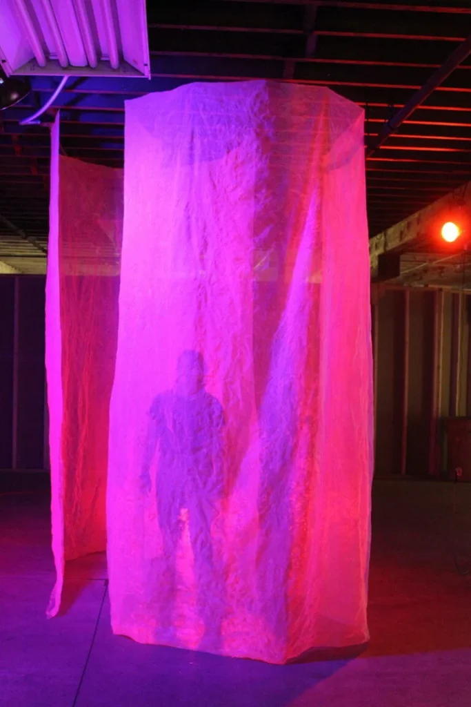 I create large scale, temporal installations made of paper, fabric and light, that challenge our preconceived notions of fragility, power and the ways in which we occupy space. My installations take the forms of alcoves or pathways, hung intuitively from ceilings and walls to embrace the viewer. The disorienting use of light, combined with the softness of the fabric, create a totally immersive experience that can transport people out of their own world, into a space where they can allow themselves to feel tender. My pieces are rebellions against the politics of hard power. I am contradicting the notion that space should be taken up with brute force, and instead positing that we need to make room for fragility. When inviting viewers into my works, I am asking them to suspend their disbelief and their frustrations, and instead to be still, for a few moments.I create large scale, temporal installations made of paper, fabric and light, that challenge our preconceived notions of fragility, power and the ways in which we occupy space. My installations take the forms of alcoves or pathways, hung intuitively from ceilings and walls to embrace the viewer. The disorienting use of light, combined with the softness of the fabric, create a totally immersive experience that can transport people out of their own world, into a space where they can allow themselves to feel tender. My pieces are rebellions against the politics of hard power. I am contradicting the notion that space should be taken up with brute force, and instead positing that we need to make room for fragility. When inviting viewers into my works, I am asking them to suspend their disbelief and their frustrations, and instead to be still, for a few moments.