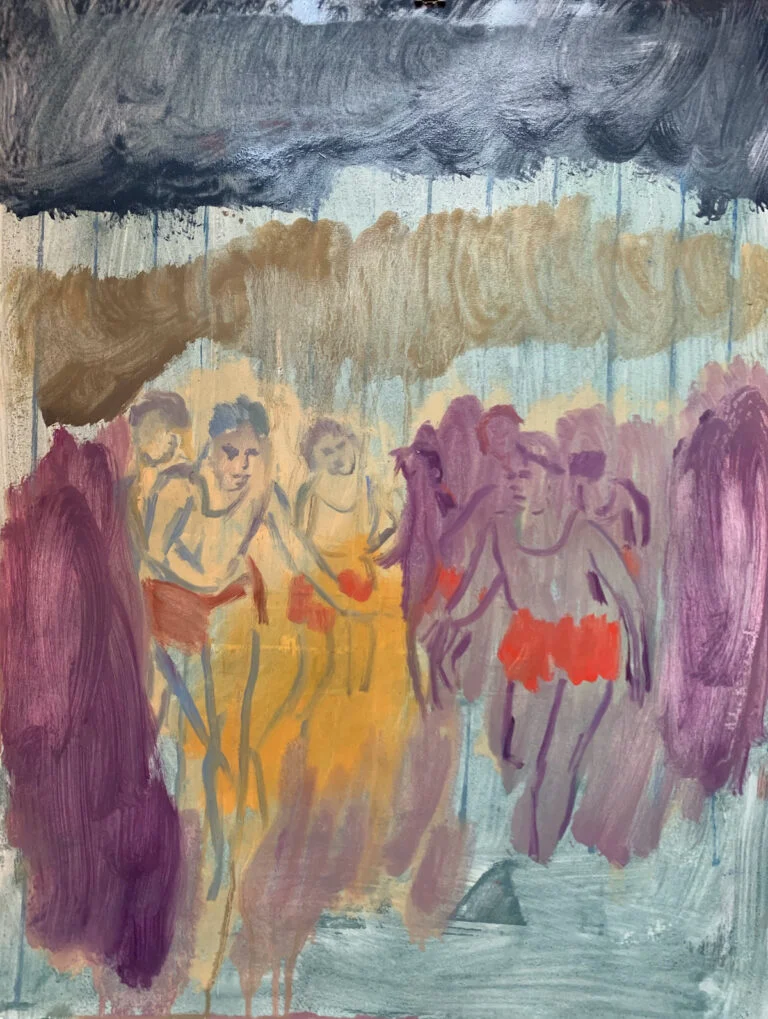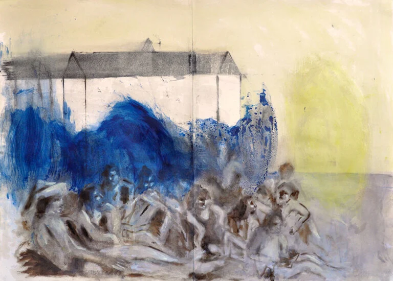 The framework will be that I continue to deal with the topic “group”. It’s been with me since I’ve been painting. Characters create relationships in space on the canvas, a narrative often emerges that says more than I initiated.
