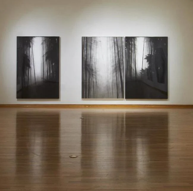 I use bamboo as my subject. Bamboo is one of the “Four Gracious Plants (Four Gentlemen)” in the Asian culture. The four plants – the plum blossom, the orchid, the chrysanthemums and the bamboo – were all chosen for their distinct characteristics and each holds its own symbolism. The plum blossom, flower of the spring, represents the unrelenting spirit of the literati scholar as it bursts even in cold weather. The orchid is fragrant plant that diffuses elegant aroma in the summer in the high mountains. It symbolizes the moral virtues of the scholar. The chrysanthemums, blooming into graceful scent and form in the late fall, stands for the fidelity and integrity in the face of adversities. Lastly, the bamboo, the plant of the winter, is seen as the embodiment of the unwavering principles and honor of the upright scholar. The Four Gracious Plants were the ideal metaphors of the moral values that the ancient scholars wanted to achieve through selfdiscipline. Of the four plants, I am particularly interested in the bamboo both for its symbolism and its aesthetic aspects; the strong linear lines of the stem that appears strengthened in the bamboo woods, and the leaves that show the movements resembling that of an orchestra conductor when the wind blows. Also, the sound of the bamboos brushing against each other in the wind clears my mind. I sometimes draw bamboos inside the moon. The silhouettes of the trees in the moon represent my longings and wishes. In the traditional Korean culture, we pray to the moon on the night of the first full moon of the year, and it is in this spirit that I depict the bamboos in the moon. I also bring the effect of light or rain into my pictures that they seep through the bamboos. I believe that the bamboos reflect myself and that they will mature as my mind and thoughts do.