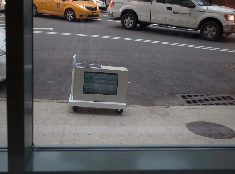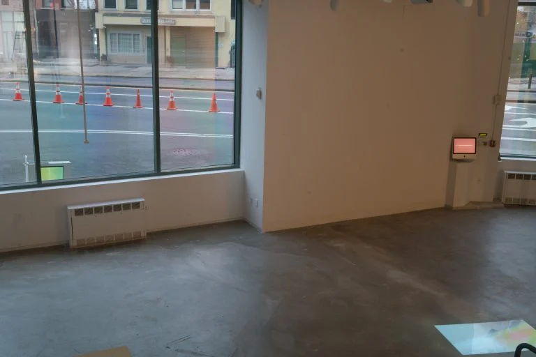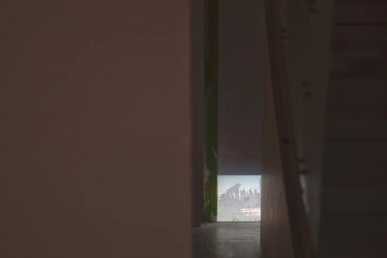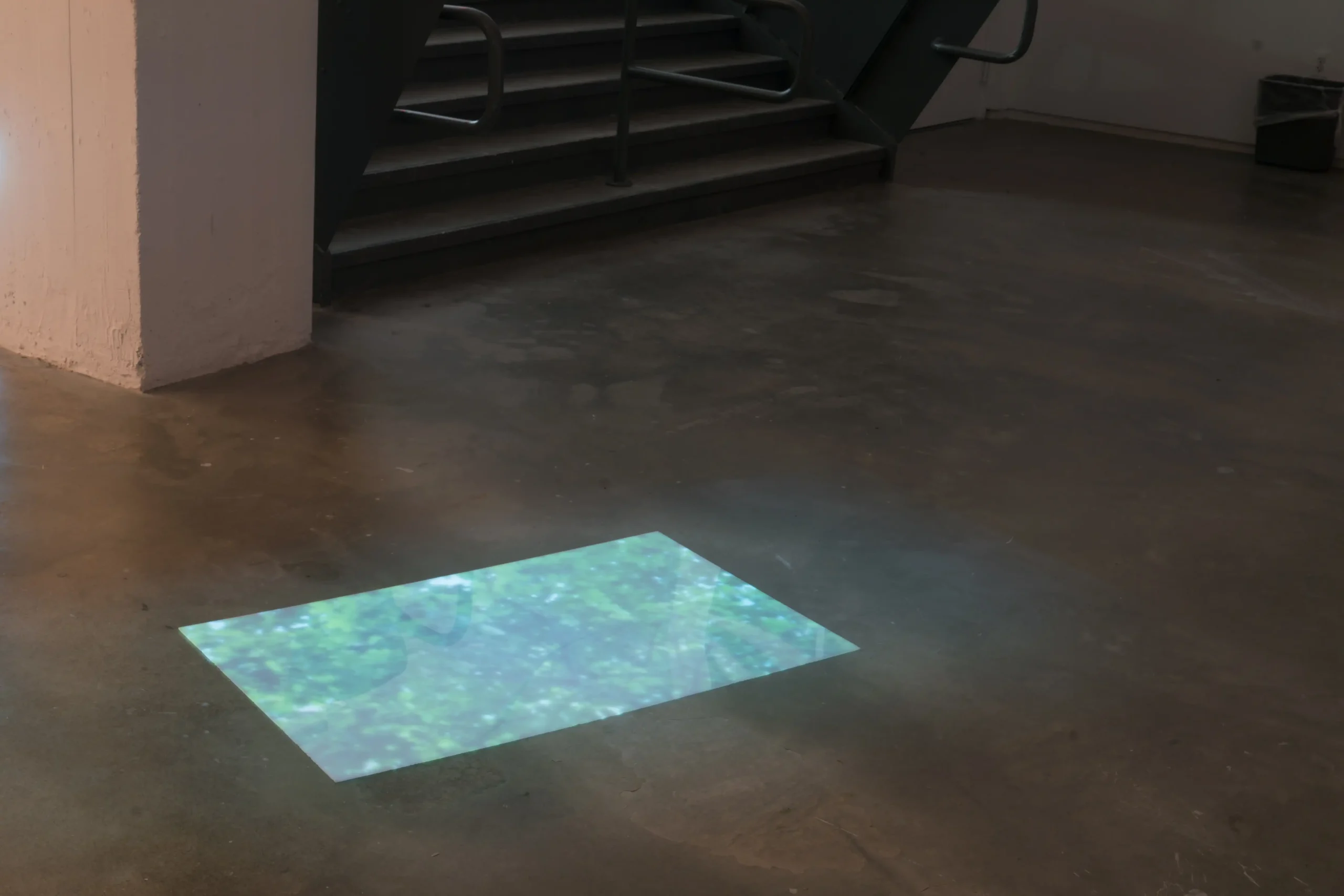When you enter the gallery there is a huge ground floor space in front of a staircase, all the pieces of work that constitute the thesis project are embedded into every corner of this huge empty space. A video projected on the floor oscillates between different scenes, the camera slowly moving around two buildings (the old Hunter MFA building and the current Hunter MFA building). On the wall under the staircase there is a projected still black and white image of a city scene, also from under the staircase there is a constant recurring daily sound/noise (freight handling, phone ringing…). On the other side of the space, by the corner of the small window, there is a screen playing a translated poem, the reciting voice coming from the ceiling. A painting with the same image as the one projected under the stairs is leaning by the window, on a specially built shelf embedded in the architecture. One can take the shelf as a peculiar feature of the existing architecture, itself rich on odd nooks and crannies. By the side of the big window, there is a pipe hanging down from the ceiling and there is sound/song coming out of it. When standing around the pipe, looking out of the window there is a cart on the sidewalk containing a monitor that plays a video with two parts (Part 1 outside of old Hunter MFA building on West 41st Street – Part 2 inside of current Hunter MFA studio spaces); looking up at the ceiling from a point close to the pipe one can see a mirror reflecting the cart on the sidewalk. All these senses are embedded in the existing architecture and can be missed or neglected at first. Not before some process of walking, looking and listening do they become more visible and start to connect. The more time one spends in the space the more their tuning gradually happens.
