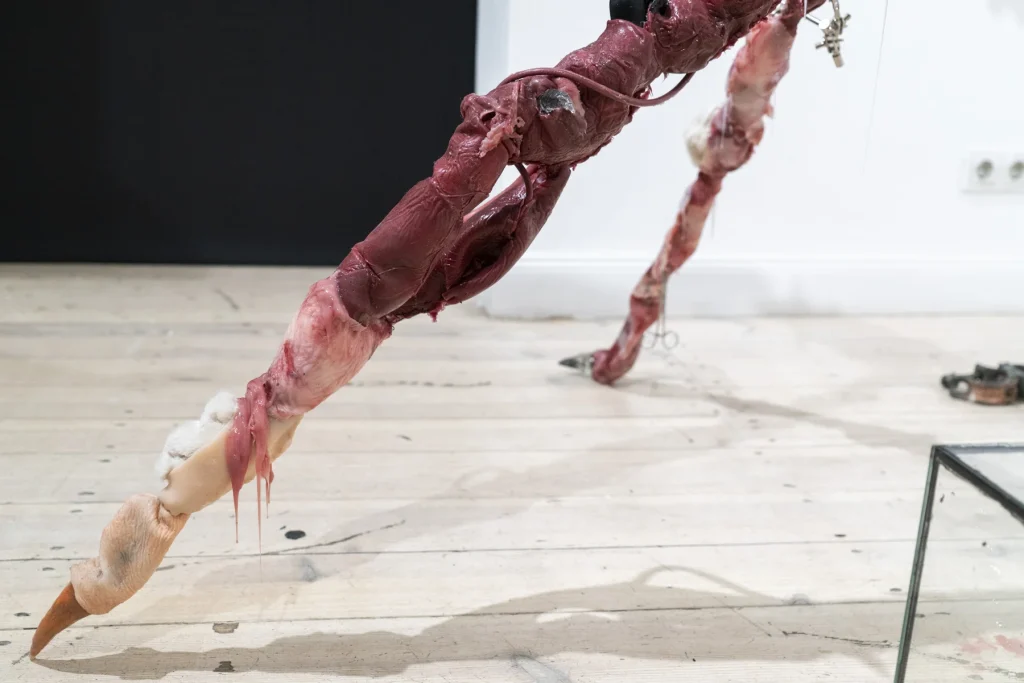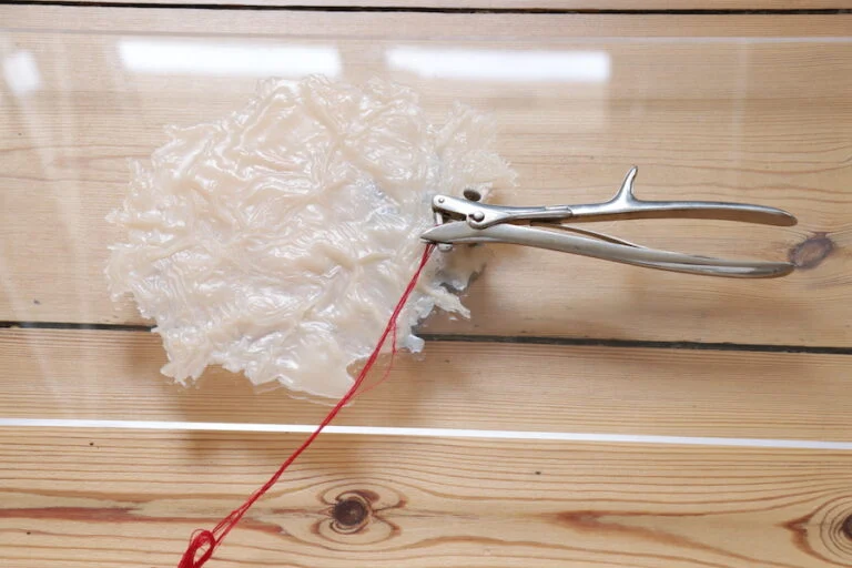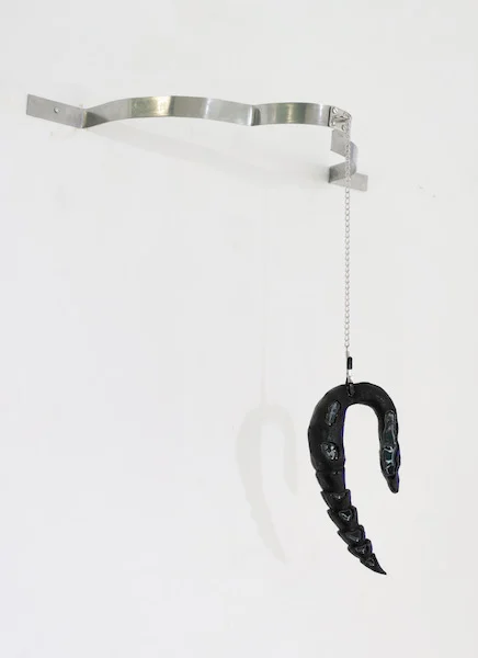 “Metameria” explores a restorative and imaginary work of a space of absence, through the idea of pleats and fissures in memory and trauma. For this project, I resort to the idea of a flexible contorted body shape, by investigating the resistance of soft organic objects made of resin, ceramic, latex and silicone, and the tension/ resistance created with self-made and found metal artefacts such as forceps, clamps, pincers and chains. I would also like to explore the possibilities between self-made liquid containers and threaded pieces within the proposed installation. These compositions or assemblies of the mutable, narrations of the past that are impregnated with actions of the present intend to expose the fragmented shape of a memory. Often mutilated and melting, about to disappear or as if an external force was pushing them to transform from the inside, these pieces seem like unrecognisable versions of something that we know. Just like it happens with the images from our past: fissures and folds converge on them. Hollows from which to inhabit the void and the collapse. This work is based on my own experience, my encounters with my past and with my family history. Particularly inspired from the poems written in concentration camps and exile by my father during the last dictatorship in Argentina in 1976-1983.