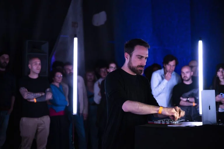 Lorenzo Ballerini’s art reflects the nature of contemporary society, using sound and light to shape space and perception. By exploring digital platforms, he challenges identity and connection, capturing the fluidity of social and political structures in our world.