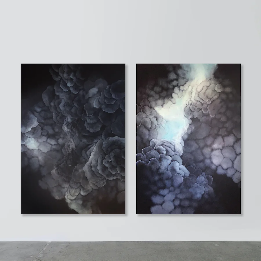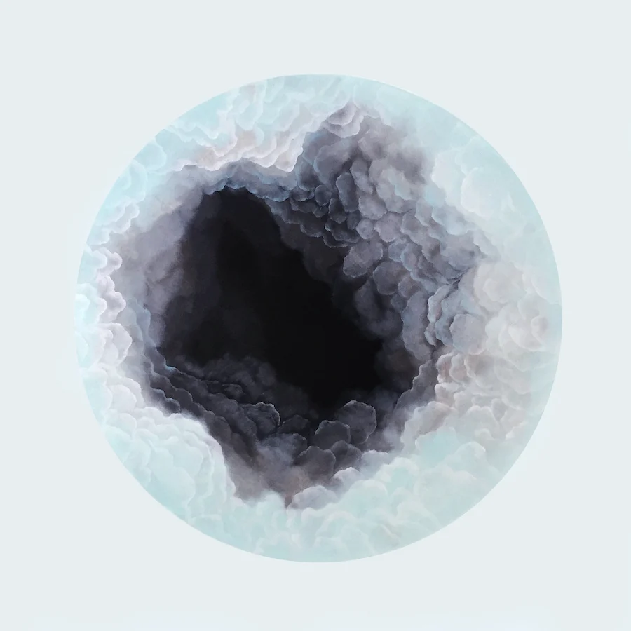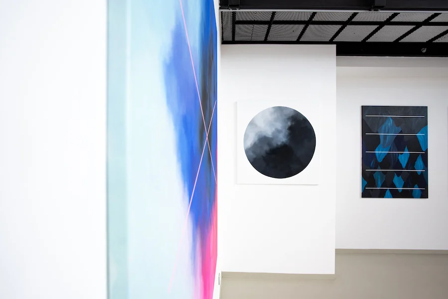 I always start with the colours in the background. I choose a specific set and explore the possibilities of how these colours mix, blend… how they interact together. At first, they are raw, by layering them I create some kind of organised chaos. It often looks like a burst of energy coming out of me, vivid and fluid clouds. I enjoy this non-specificity. Then I continue with the geometric shapes in the foreground. I use them to add another layer. Not only visually, but also as symbols of hidden meanings and agenda that I often have within the series. To me, they are these rational “dots” that are piercing the clouds and adding context. To me colours are like feelings and shapes are like words. Only together they create visual sentences. Together they have a meaning.