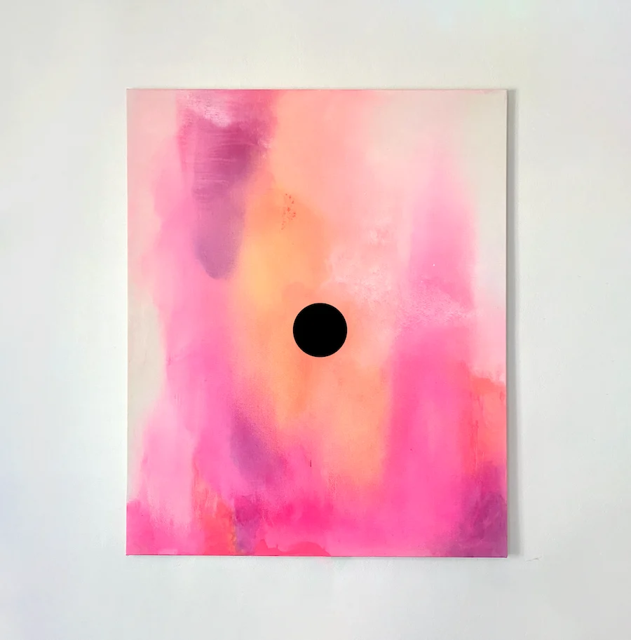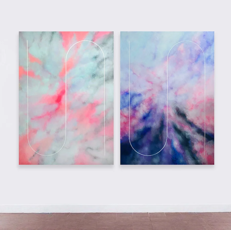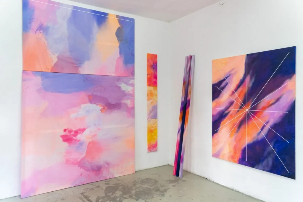 Her paintings are both playful and bold. While the background of the artworks is a vague, sophisticated colorplay, the foreground consists of strict geometric lines. Motifs in the foreground do either negate or support the background.