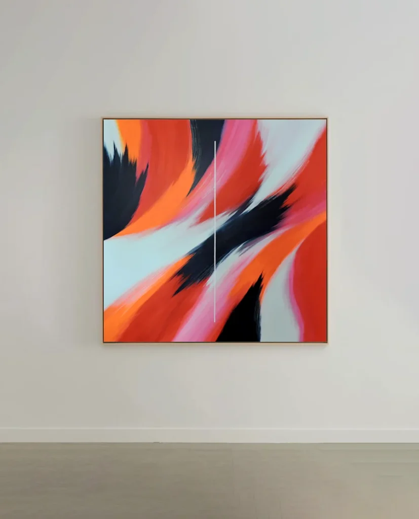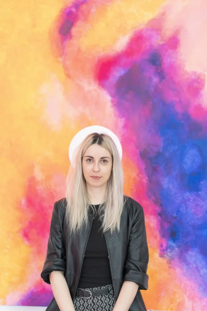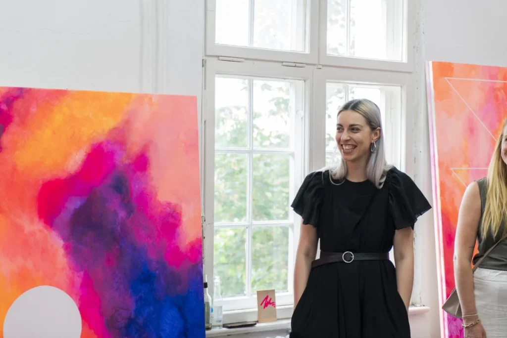 Meet Magdaléna Ševčík, a professional abstract painter, whose paintings are a vivid blend of playfulness and boldness. The canvases showcase intricate color interplay as backgrounds, contrasted by precise geometric lines in the foreground. These foreground motifs either negate or harmonize with the backdrop.