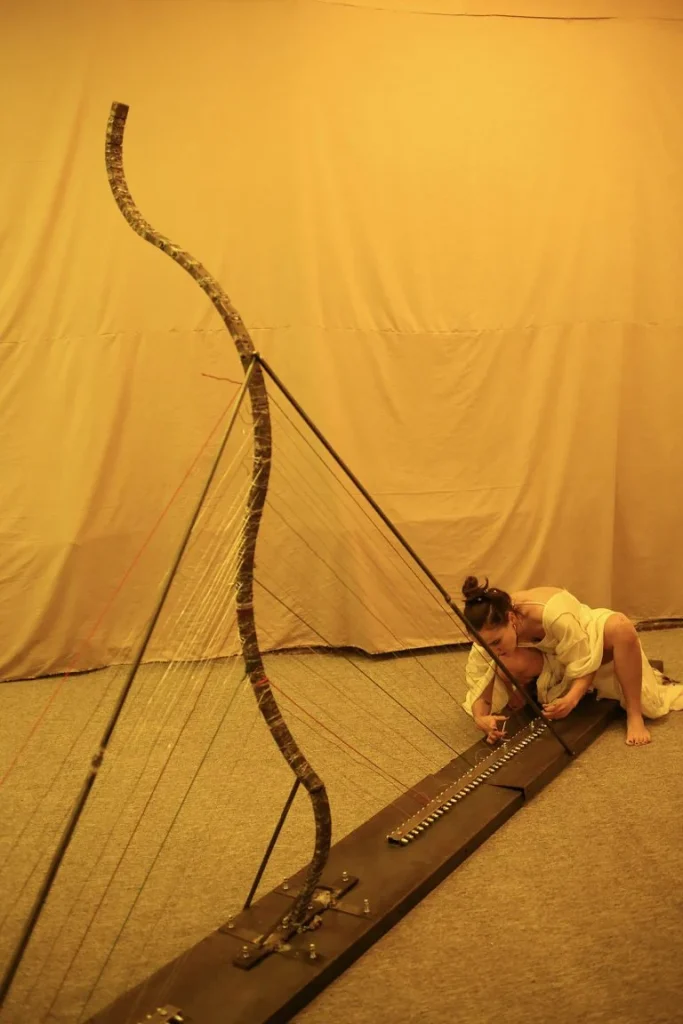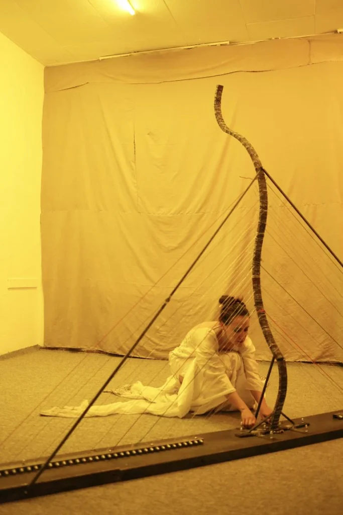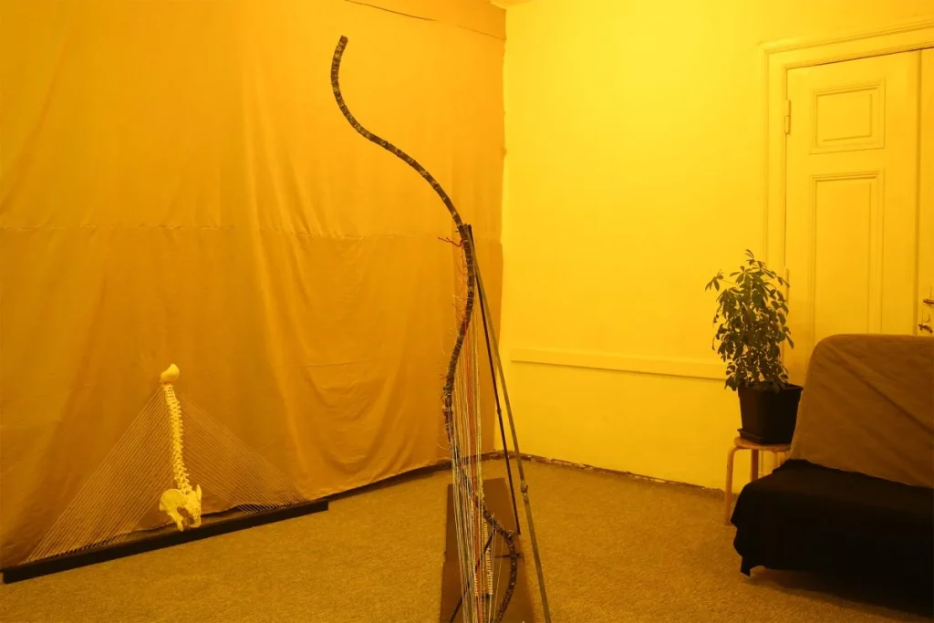 After presenting my last piece (Contra-ritual), I was left with many concerns and the desire to continue exploring music and sounds as an element for my proposals. I am interested in the infinite forms that sound vibrations can take to produce enveloping atmospheres. According to this, during my program as an artist in residence at GlogauAIR, I want to create an interdisciplinary project in which the media of performance, sculpture and sound converge to produce a sensory and immersive experience; A staging in which the performer play with the sound using the voice and a hybrid between sculpture/instrument, generating a material contrast in which the organic and the synthetic intersect with the body-object relationship. As for the sounds or musicalities that can result from this sculptural object, the idea is to formulate a kind of language in which actions, temporalities and sounds are constantly communicating.