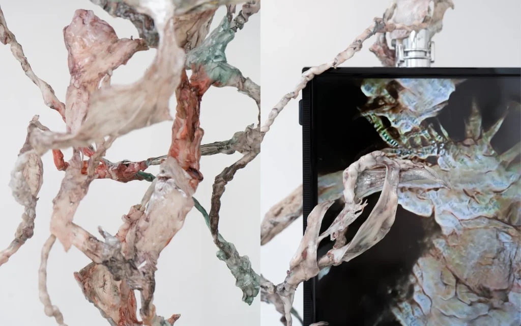 Drawing inspiration from the fields of anatomy, and algorithmic cognition, this new body of work examines human relationships through technology. The research focuses on notions such as symphysis, hybridism/mutation, parasitism/vampirism, becoming and togetherness. Additionally, future discourse on the potential singularity* will round out this set of references, examining the dynamic tension between humans and artificial intelligence. This new work consists of an installation (sculptures, objects and sound). It addresses the contemporary phenomenon of midness reflecting our current environment by highlighting physical fatigue associated with media saturation and the accompanying sense of unease and awkwardness.