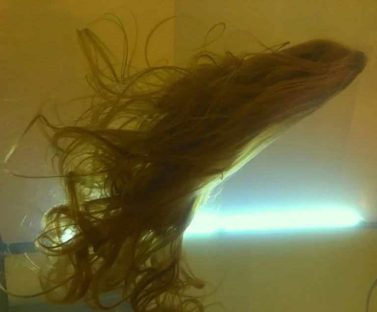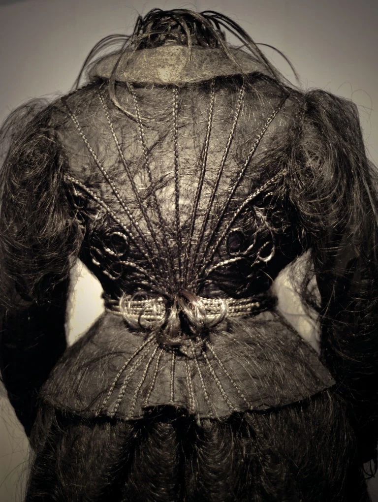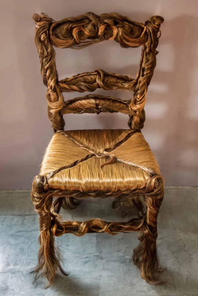 I am often referred to as the Hairtist, because I have a predilection for using synthetic hair in my work. Hair Brut is a closer definition as my creations could be Art Brut using hair exclusively. Creating strong symbolic evocations and infinite creative power, I joyfully manipulate it in all its forms for installations, or crafted objects. Tamed or savage and in unending combinations of color blends, hair constantly challenges me. Handling these strange threads requires a constant defiance of control and patience. Freed from the confining shapes of human heads and ‘hairstyling’ and taken as a crude, ruthless material, it offers an amazing world of possibilities. The challenge to push the boundaries ever further, to deconstruct and reinvent the use of this primitive material inspires me to continue exploring the art of Hair Brut.