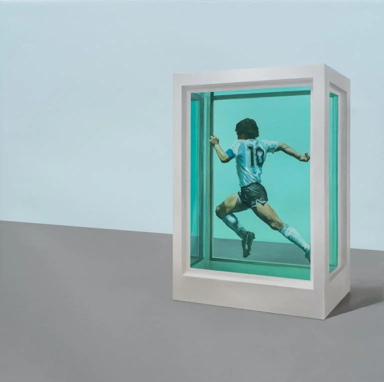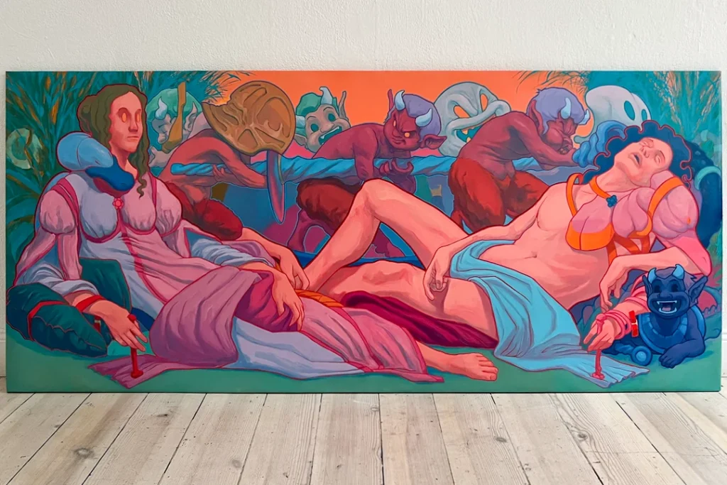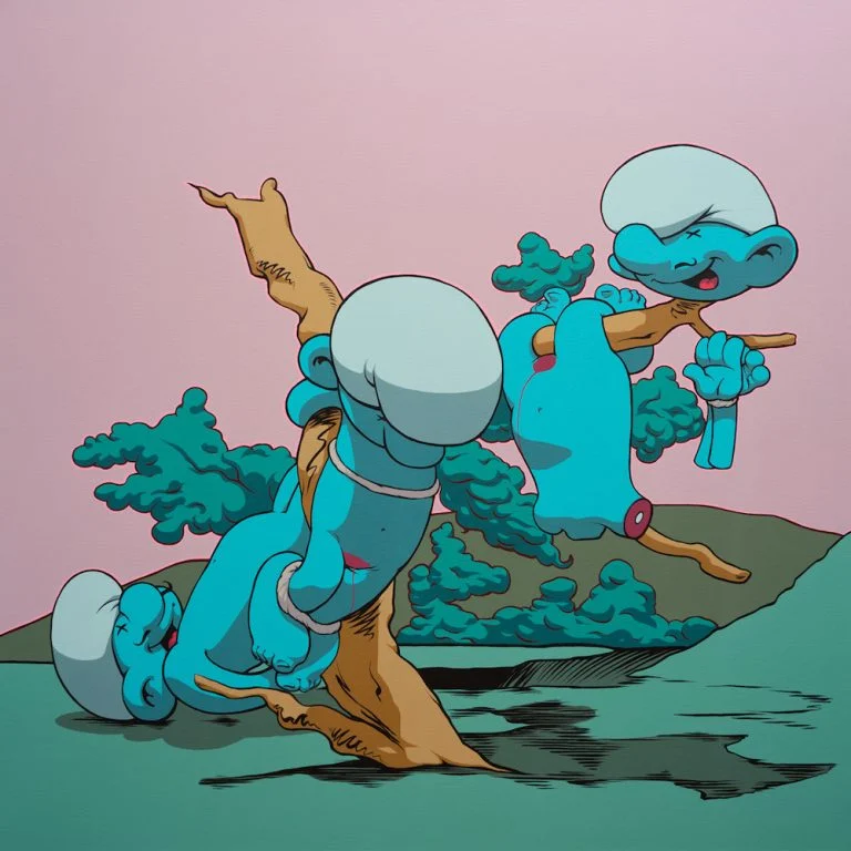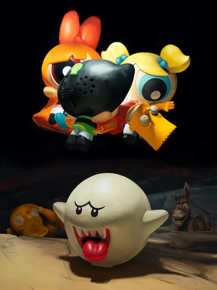Nelson’s work remixes iconic images from popular culture and art history through painting, blending digital and traditional media with irony and humour. By assembling digital scenarios from various sources, he constantly reinterprets the real and the digital, finding beauty in the mundane.