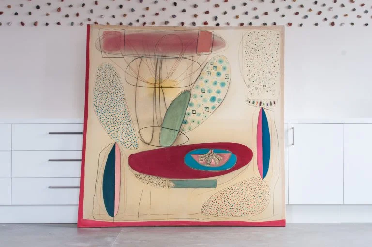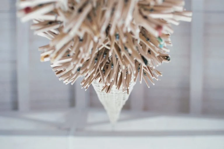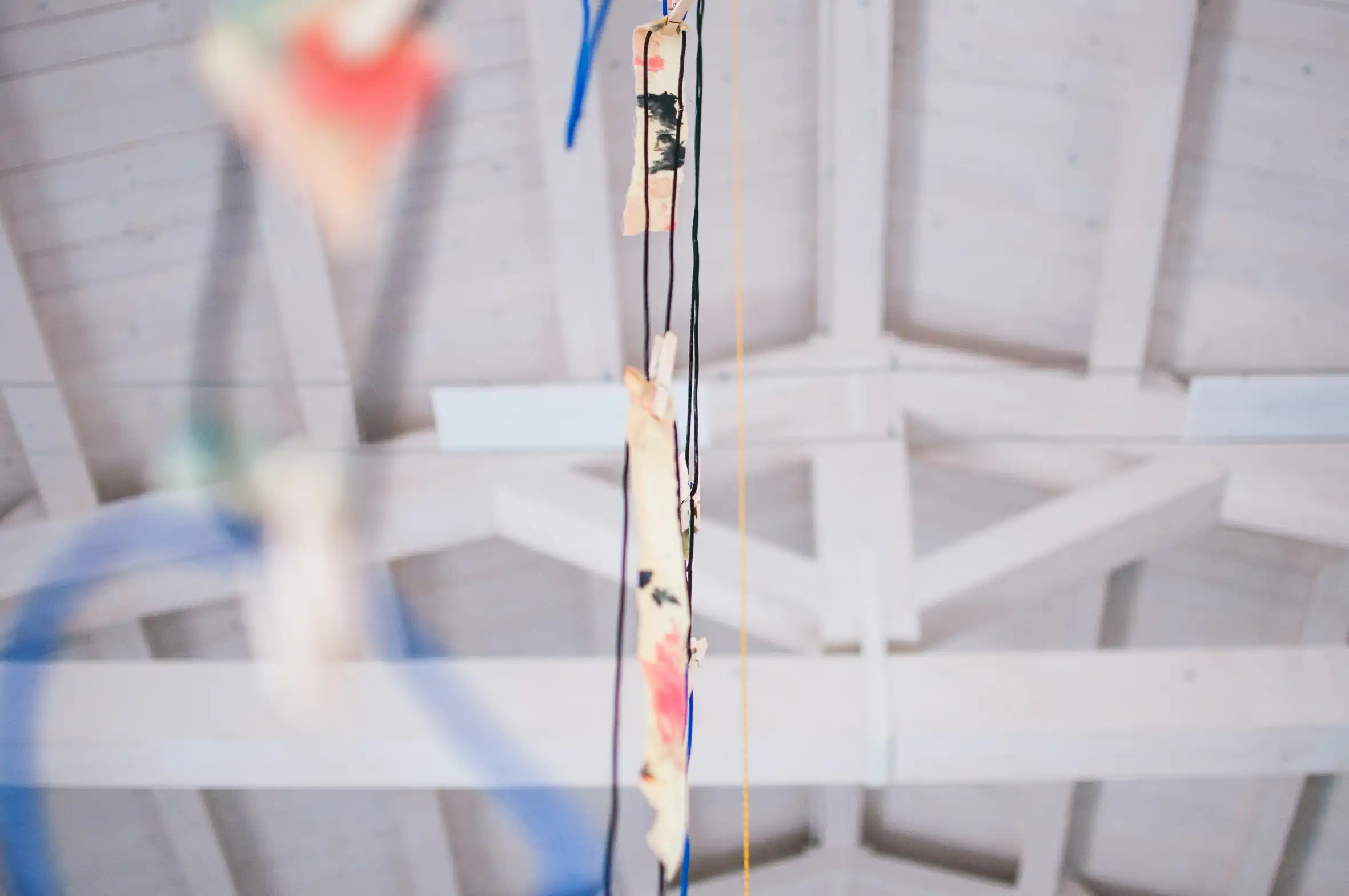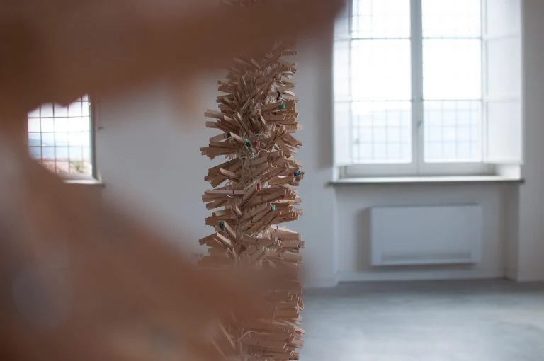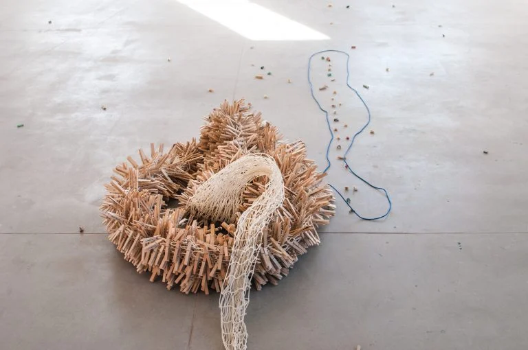Architecturally, I intend that the space will be occupied by the images that will be supported by a structure of varying size and material depending on their place in the studio (height, weight and dimension). When I build these spatial images I usually rely on objects of everyday use which I then manipulate and decontextualise. I would like to carry on my work using wooden pegs and fishing nets as a medium to perceive space and form in a different way. The specific function and nature of these materials allows me to research even more deeply painting’s nature and space.
