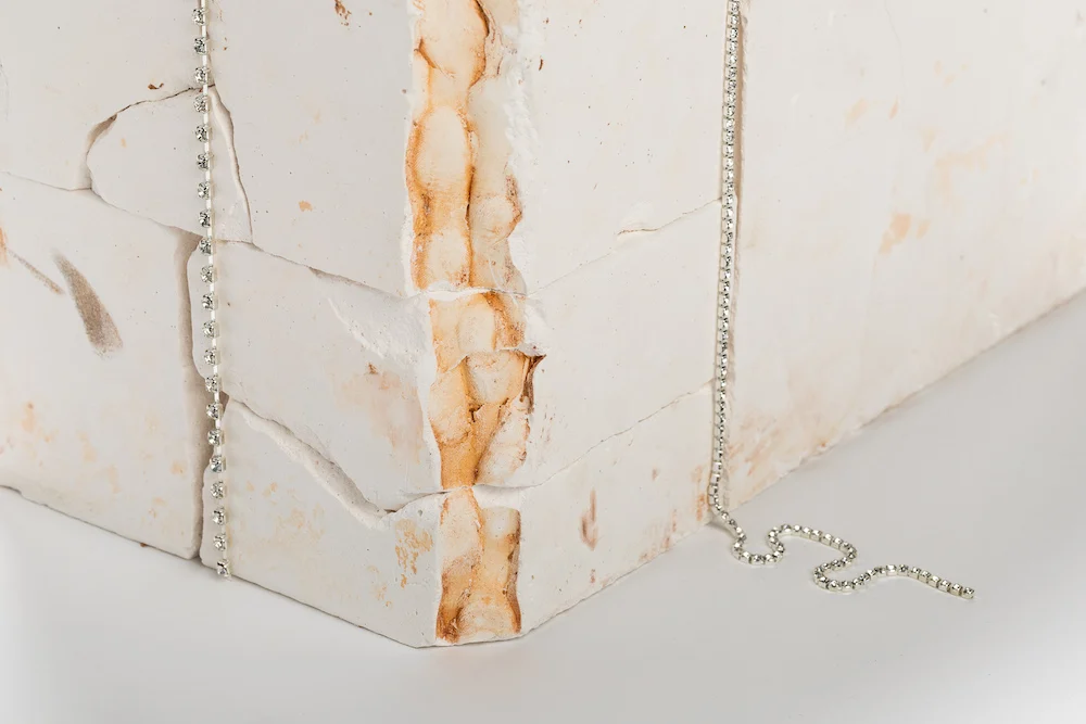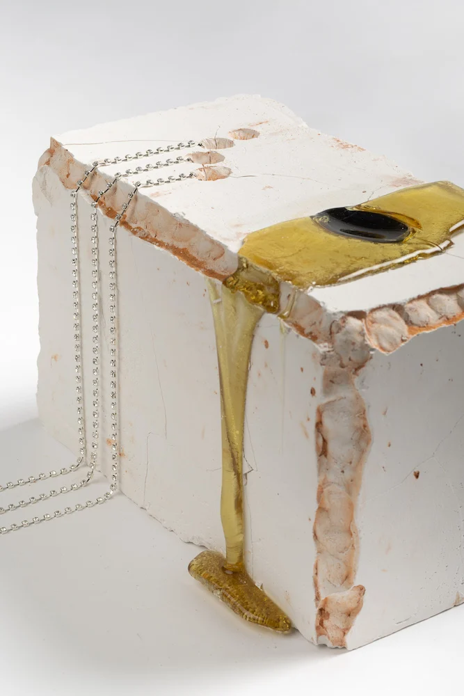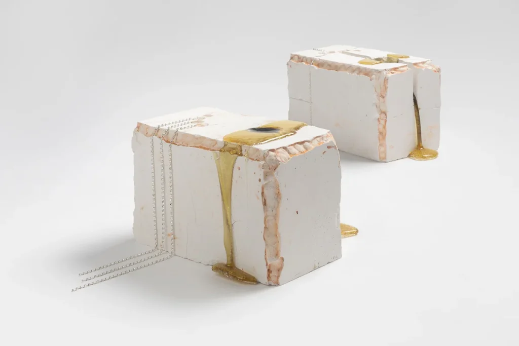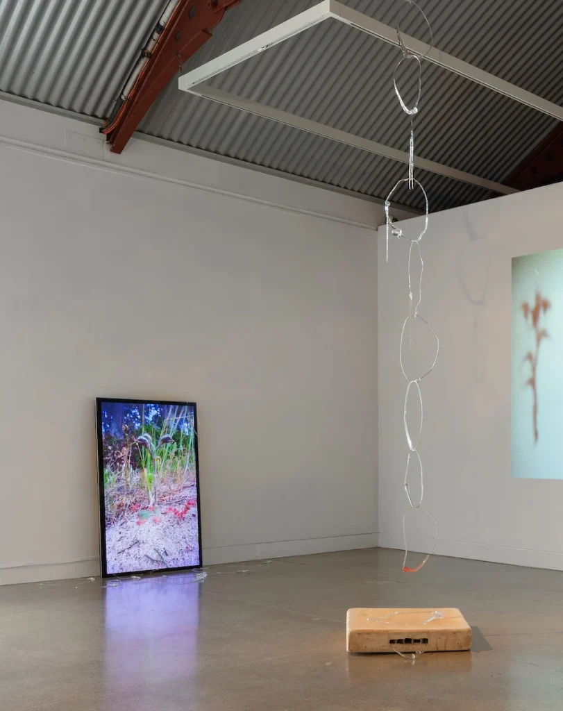 Ethereal, tender and wonder-filled combinations of varied materials become inquiries into political narrative. Using methods that include hot glass techniques, glass kiln-casting, pouring and assemblage—leakages reveal themselves as material investigations. The formlessness that refuses to take shape, to behave as an object.