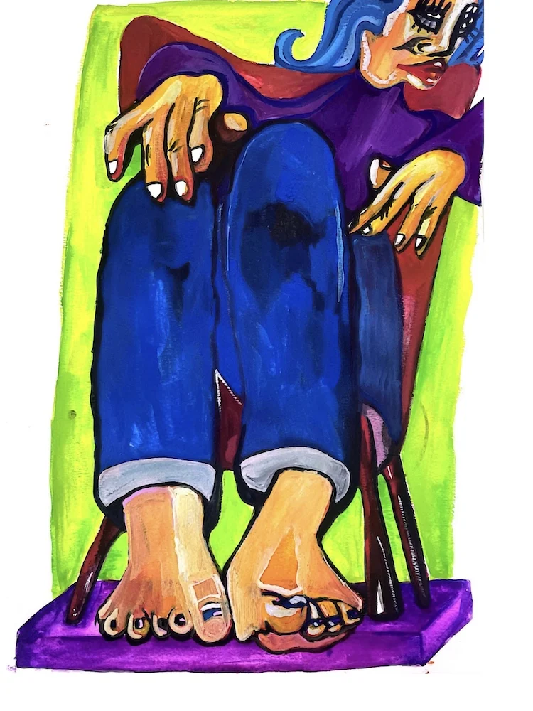 She works with acrylic and oil paint, illustration and multimedia collage.