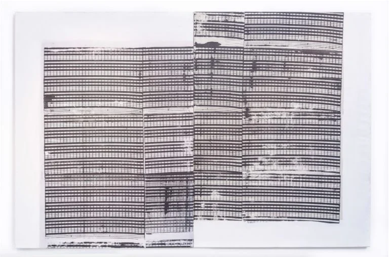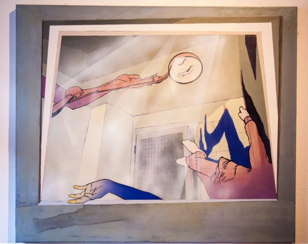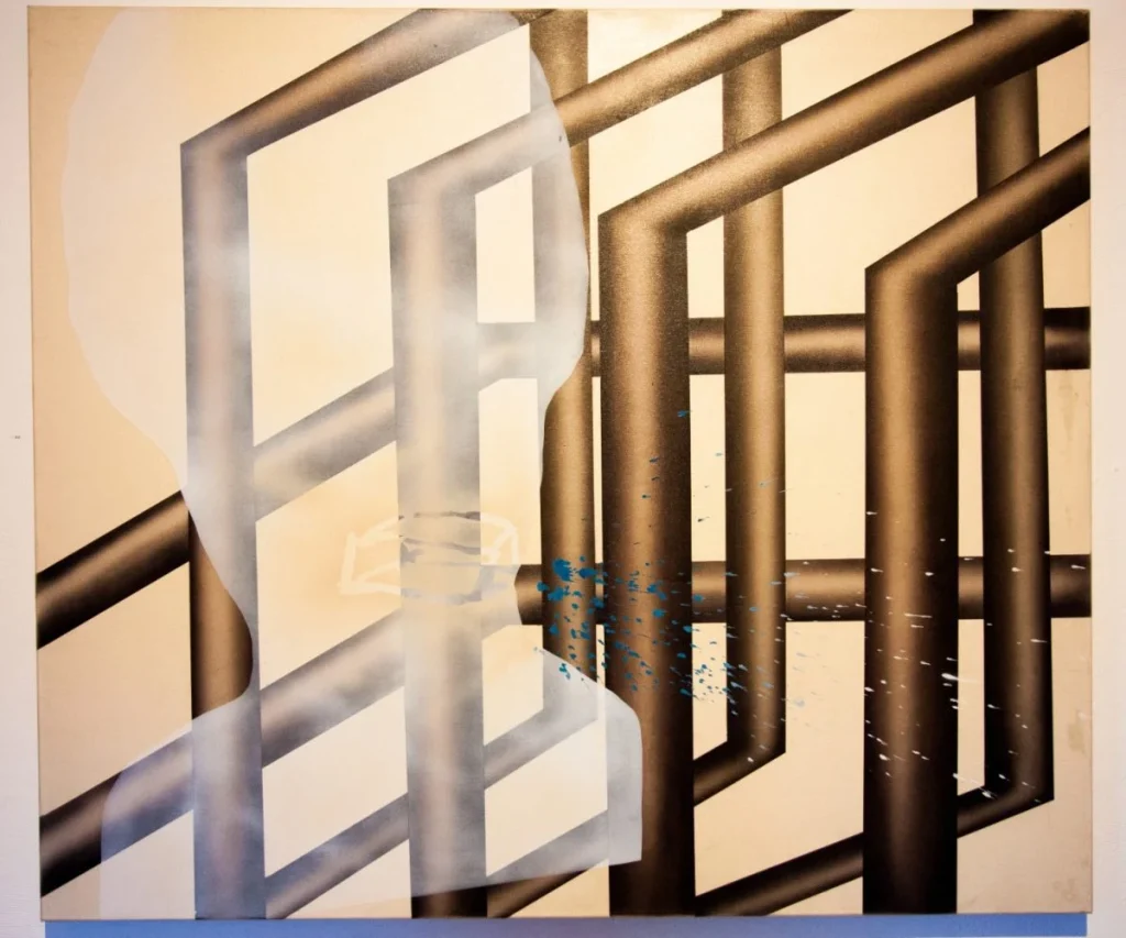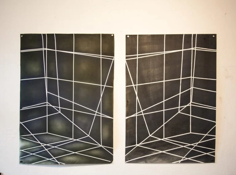 The GlogauAIR studio space will be utilized as both studio and installation viewing space. Large stretched and draped canvas panels will delineate an L shaped room that will mirror itself from both entrance doors, without requiring the viewer to need to enter the space. The mirroring effect is an analogy to the installation’s concept of “algorithmic echo chambers”, meaning the reverberation of content that cycles through highly complex algorithms that result in creating an illusion of information and culture. The installation is modular, and its paneled paintings will be exhibited parallel to three individual upcoming shows in Paris, Barcelona, and Berlin.