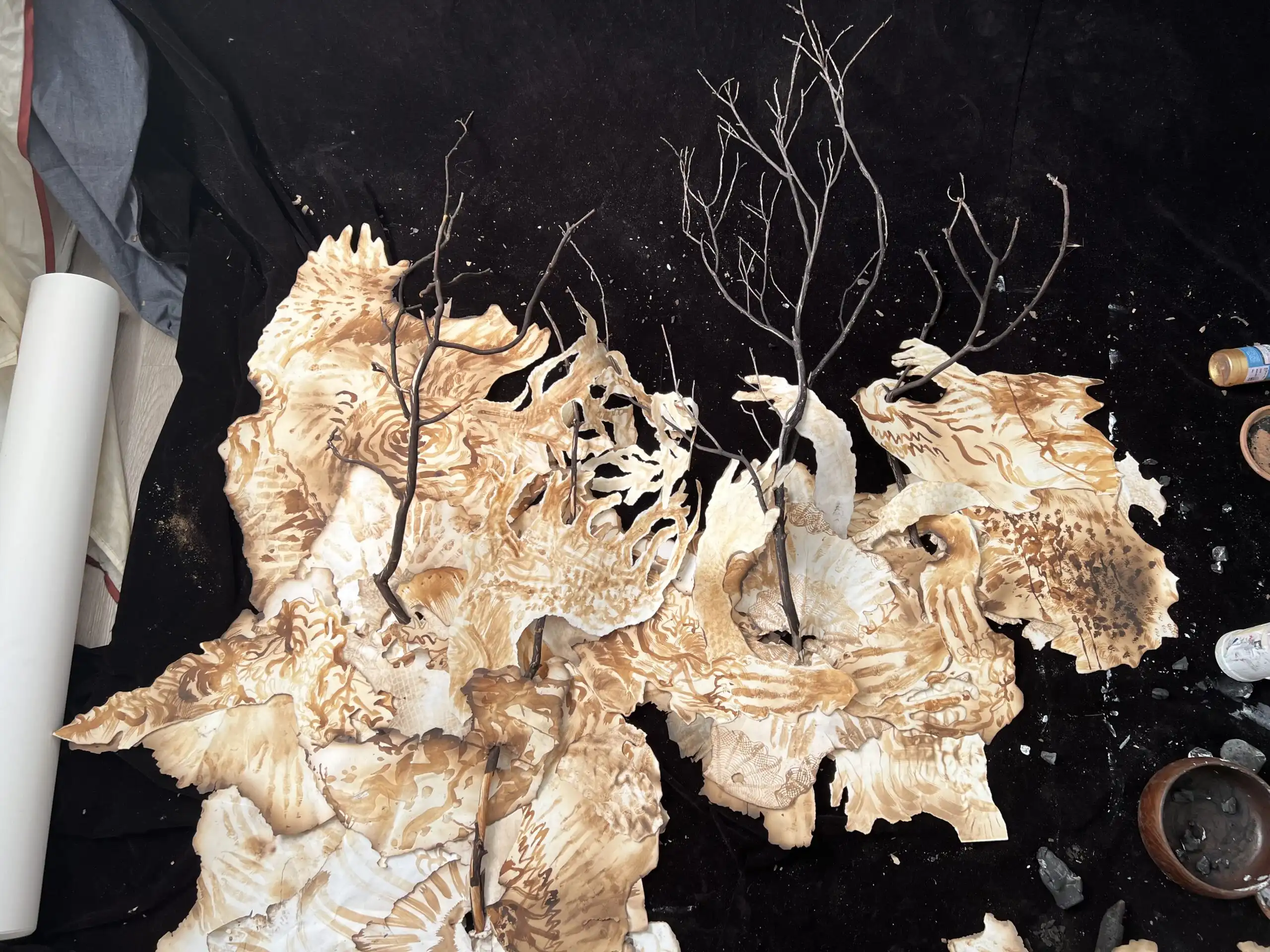 For this project I am developing a process of using my breast milk in a painting, burning, and collage cycle/ritual. Using video projection and painted paper sculpture woven with salvaged wood from a forest fire, I wish to draw a parallel between my creative process and the cycle of forest fire and regrowth in Robert Louis Stevenson State Park, California. The project will culminate with a 3-part video installation depicting natural cycles of my body/breastfeeding and of the forest, as well as a large-scale sculpture made of paper, breast milk, and burnt wood.