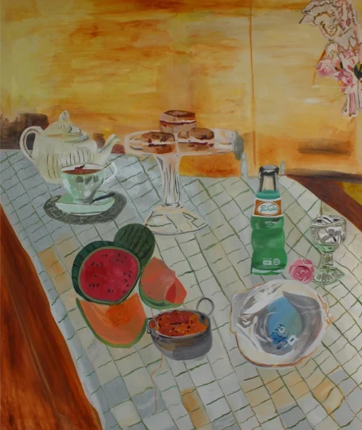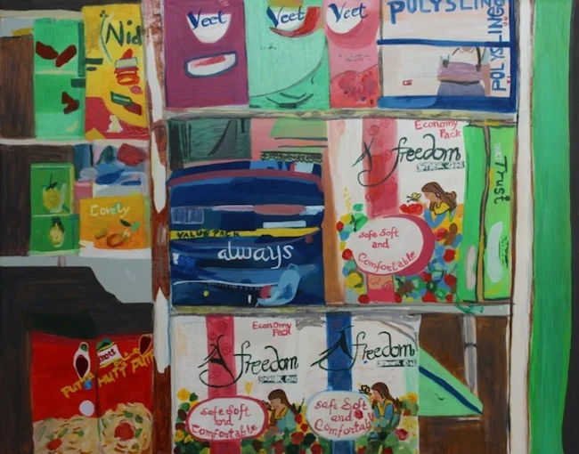 At Glogauair she worked on a project about food how it is commercialised and advertised. Her paintings besides being on canvas and board are also on diverse supports like Aluminium and patterned vinyl