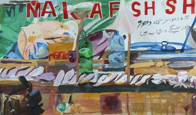 From the receding interior spaces of the boudoir, shrine or sitting room in Uzma Sultan’s earlier paintings, the flattened and patterned surface has come surging forward in her recent works, painted both in Karachi and as part of a residency at Glogauair in Berlin. Including stacks of Tibet powder and cooking oil tins, a crowd of painted vehicles, and a multiplied bed of charpoys viewed from an impossibly high angle, these paintings are rendered with Sultan’s characteristically crooked figuration. In the last case, Sultan appropriates the stacked perspective of the early miniature tradition, flattening and tipping the horizontal plane upwards and towards us. Alternately exaggerating and muting particular colours, the patterned surfaces that Sultan’s paintings represent are vibrant, and yet also rather barren. Most particularly, these paintings reflect the joy of the mark, of pushing colours against each other like unhappy lovers. They reflect the dance of paint on matter, in this case on impervious surfaces such as aluminum, vinyl or perspex. These works flirt with ugliness, with the shaky gesture of the brushstroke, and with the imprecision of an unplanned composition. They demonstrate that painting, in the end, is not only about painting pictures, but about making paintings. About the painful pleasure of paint, colour, surface and form.